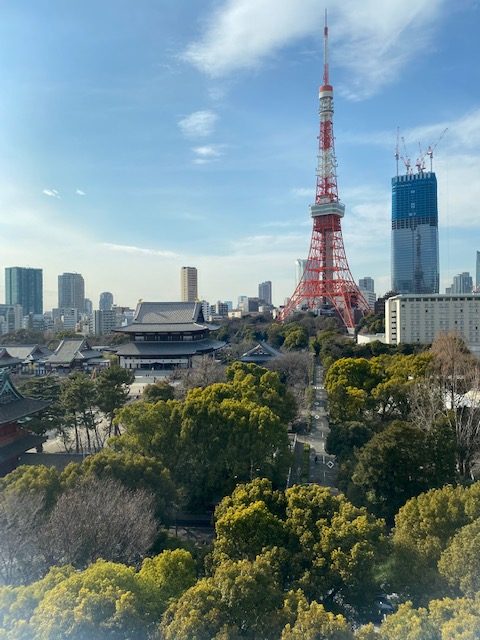時間は11:00近くになり、搬入班のメンバーが次々出社してきました。コロナ禍なので、顔を合わせるのが久しぶりの社員も。床ではまだ職人さんが作業中なので、邪魔にならないように東京タワーを眺めながら、隅っこでしばし待機です。