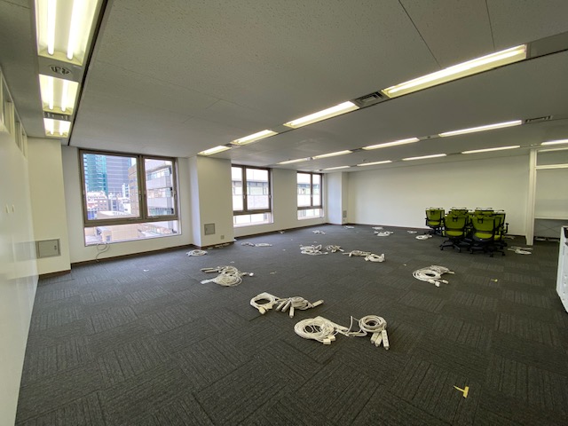 フロアに到着したら、電源工事がまだ終わっていないのか、職人さんが床に這いつくばって作業をしていました。