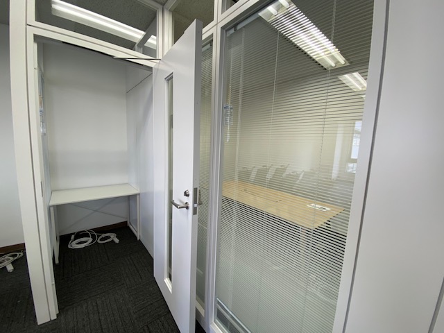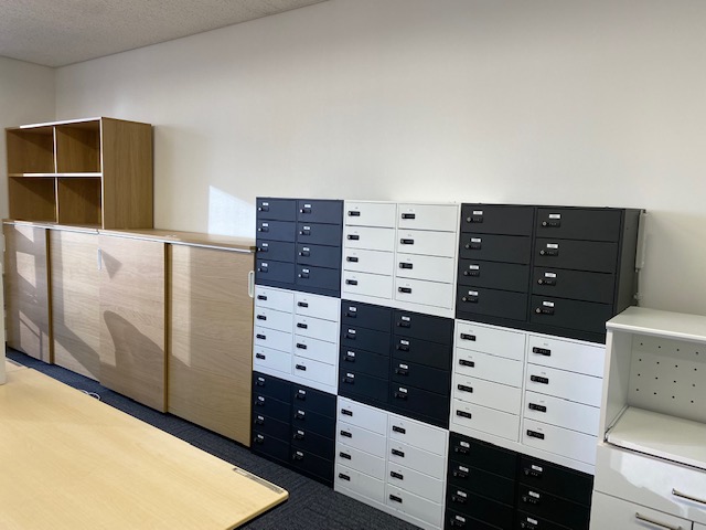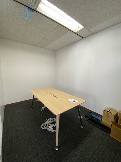 まず床が完成したところで、キャビネットなどの什器を会議室エリアから執務室エリアに移動して組立ていきます。業者さんが。